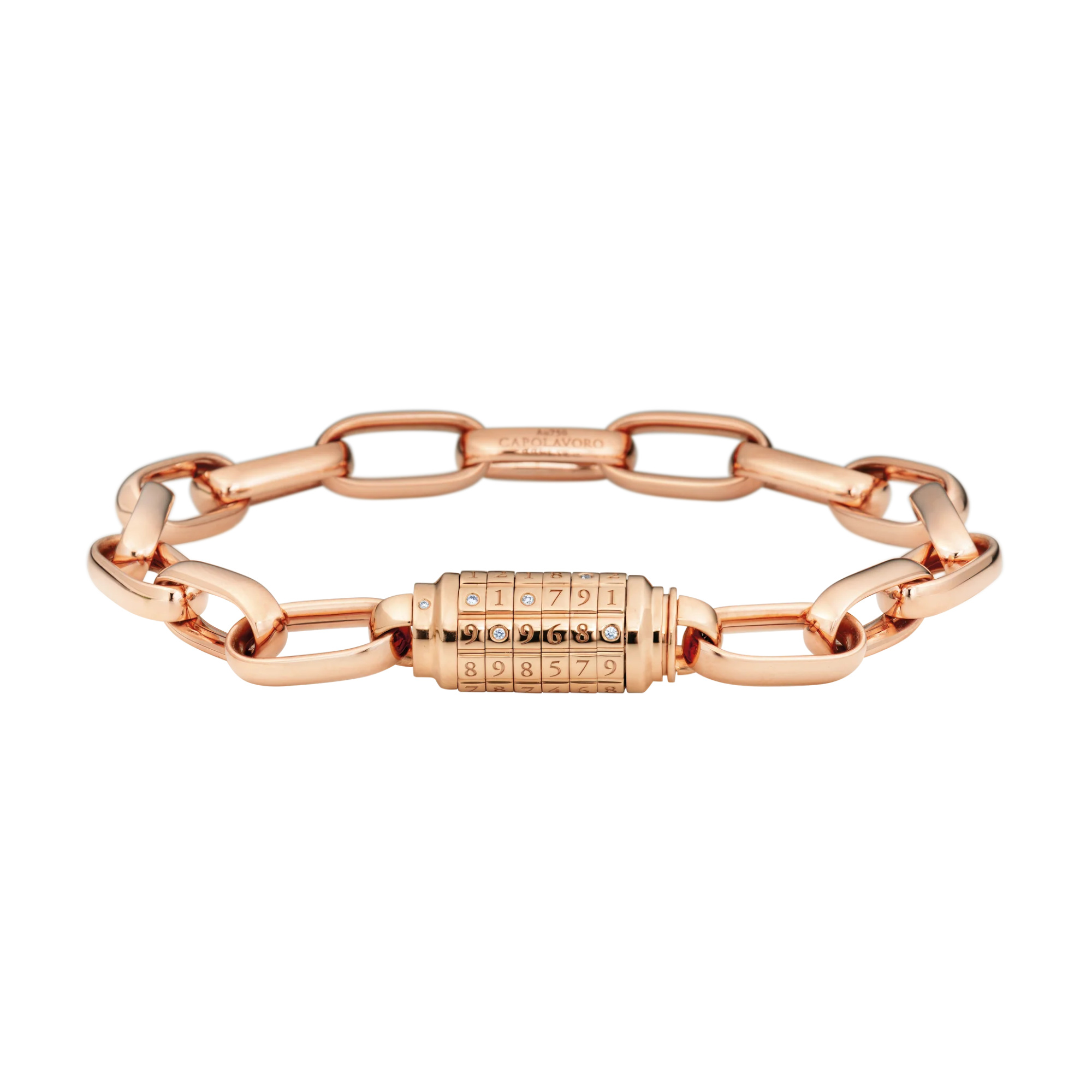 Ref. AB7BRW00376.INNEN.17-M - Das exklusive Schmuckstück CAPOLAVORO LOVE LOCK ist ein Meisterwerk aus feinstem 18-karätigem Gold, das durch seine einzigartige Verbindung von Eleganz und innovativer Funktionalität besticht. Besonders macht dieses Armband der Verschluss – ein kunstvoll gestaltetes Zahlenschloss, das mit funkelnden Diamanten und individuell auswählbaren Zahlen verziert ist.