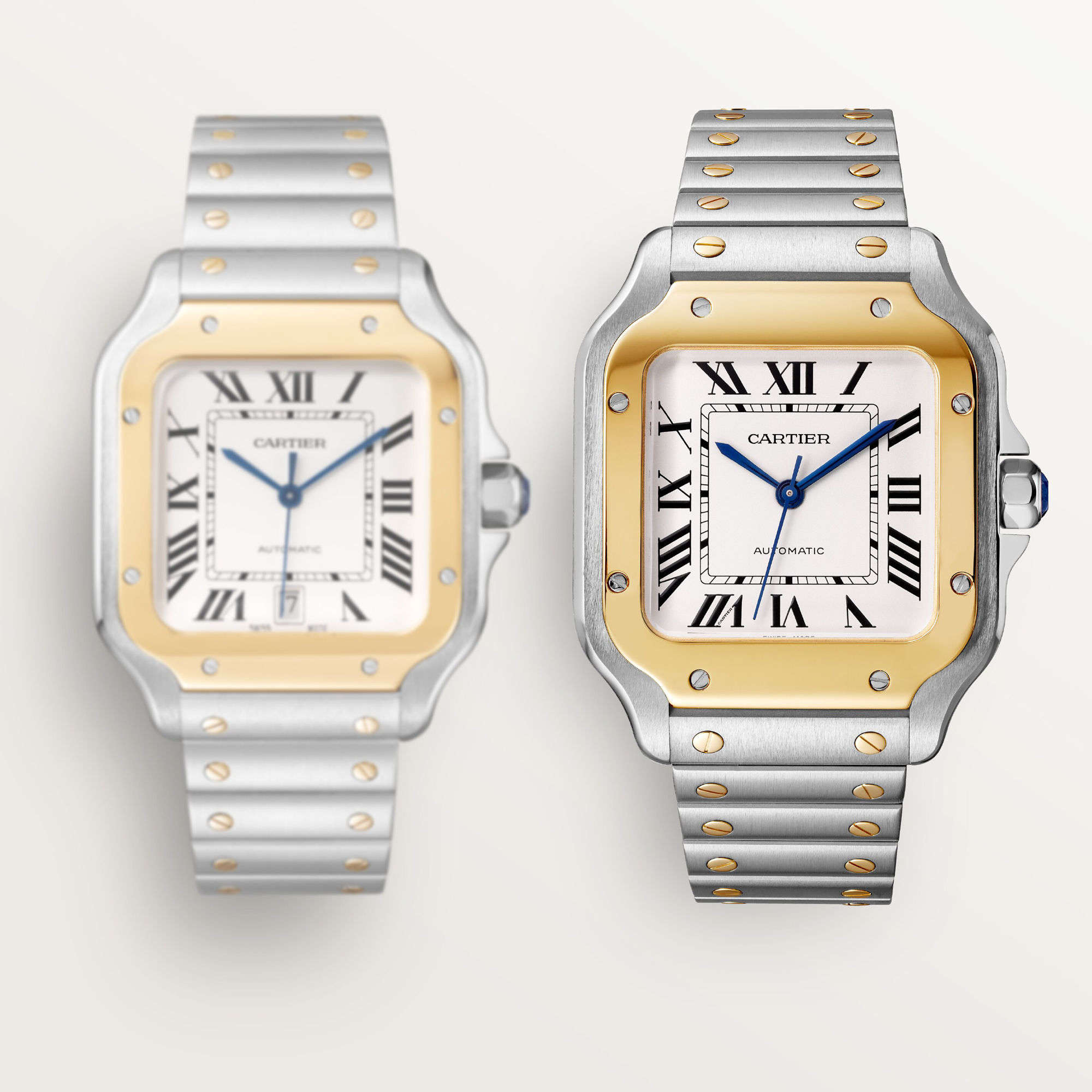 Armband aus Edelstahl mit SmartLink-System zur Längenanpassung. Zweites Armband aus Kalbsleder, verstellbare Doppelfaltschließe aus Edelstahl. Beide Armbänder sind mit dem QuickSwitch-Armbandwechselsystem ausgestattet