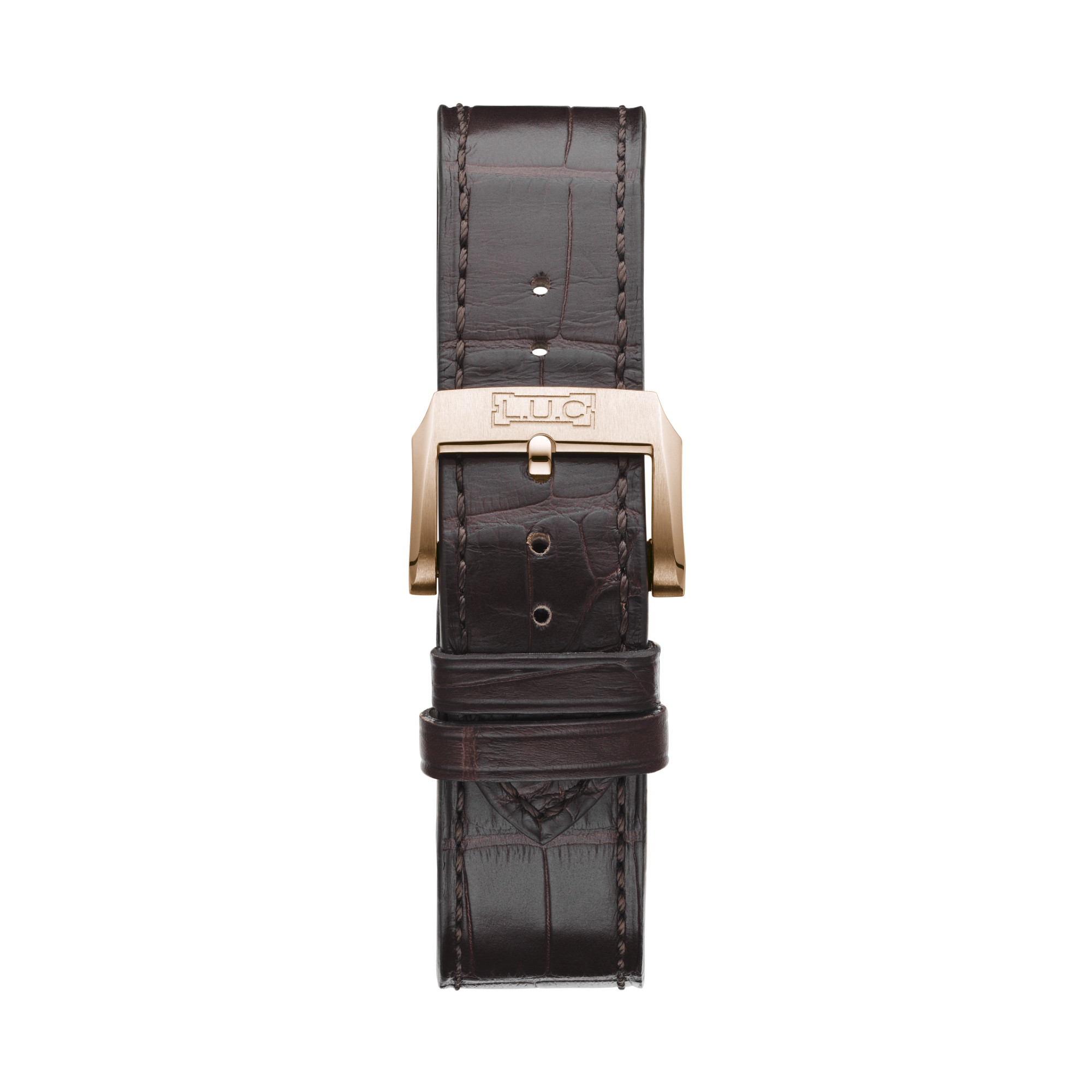 In einer braunen Farbe, die durch Galvanisierung erreicht wird – satiniertes Finish mit Sonnenschliff mit L.U.CHOPARD-Logo als Fokuspunkt – arabische Ziffern und Indexe mit Super-LumiNova-Beschichtung