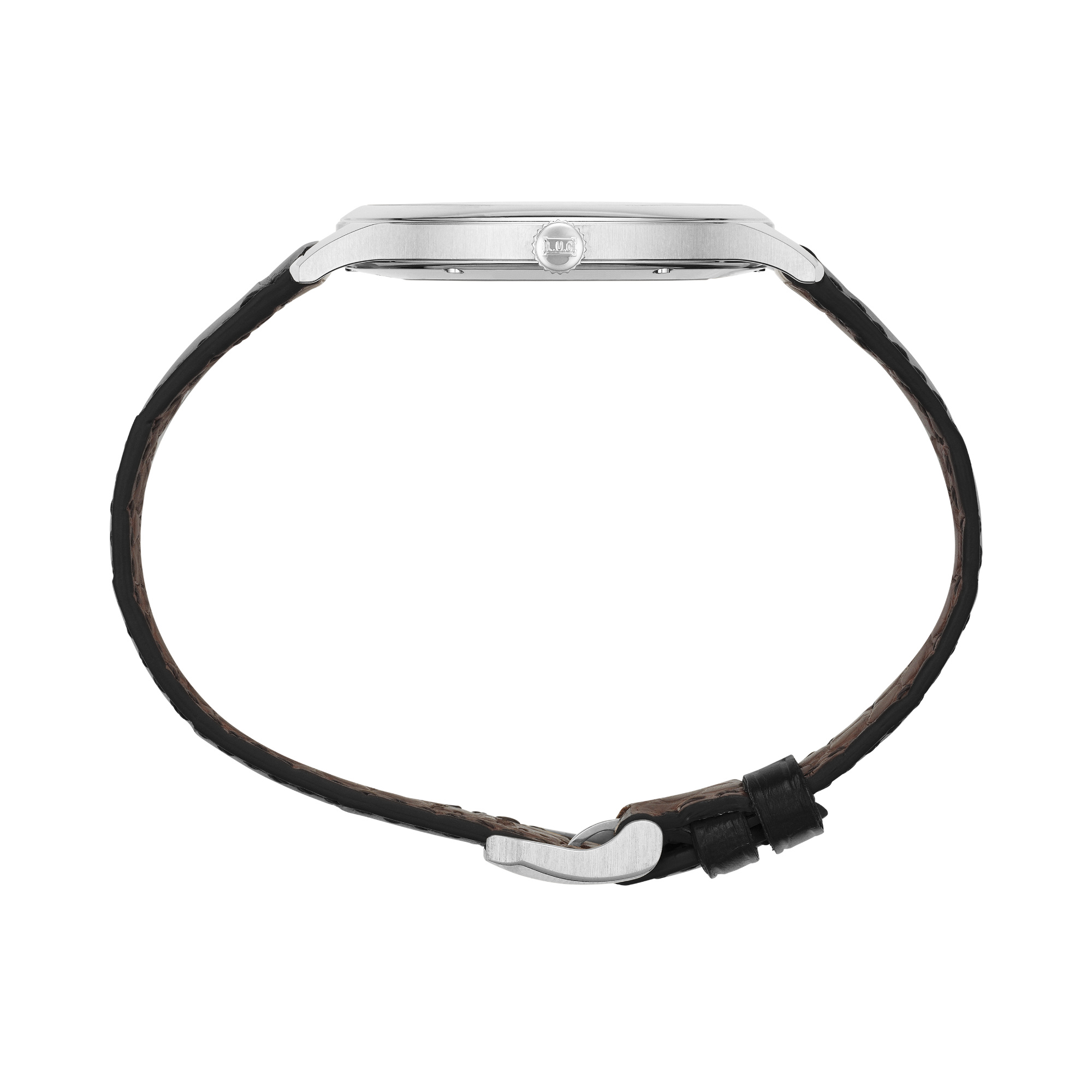 In einer schwarzen Farbe, die durch Galvanisierung erreicht wird – satiniertes Finish mit Sonnenschliff mit dem L.U.CHOPARD-Logo als Fokuspunkt – rhodinierte arabische Ziffern und Indexe