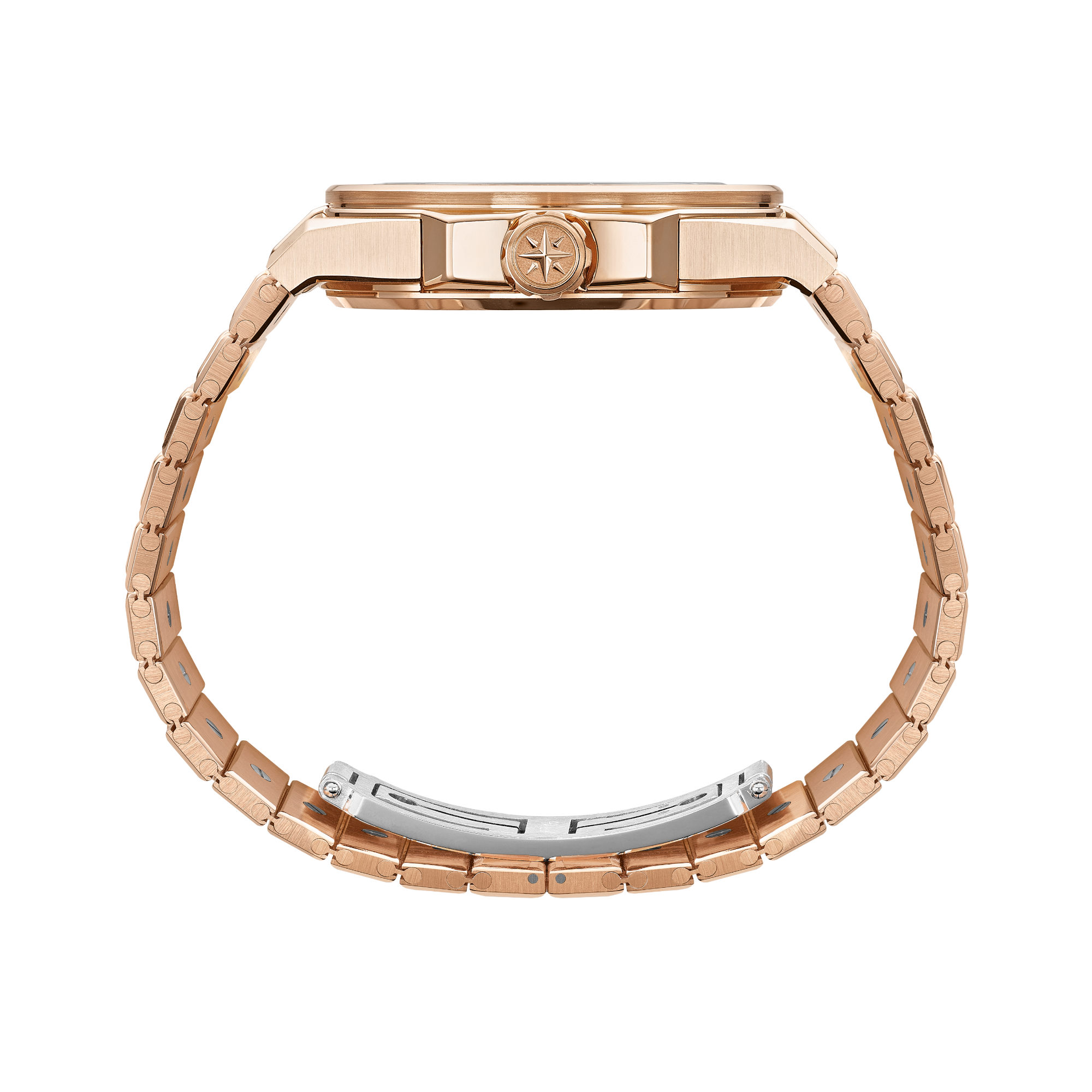 In der galvanisch hergestellten Farbe Pink Dawn. Das Finish der Oberfläche ist von dem Auge eines Adlers inspiriert. Mit vergoldeten römischen Ziffern und diamantbesetzten Indexen.