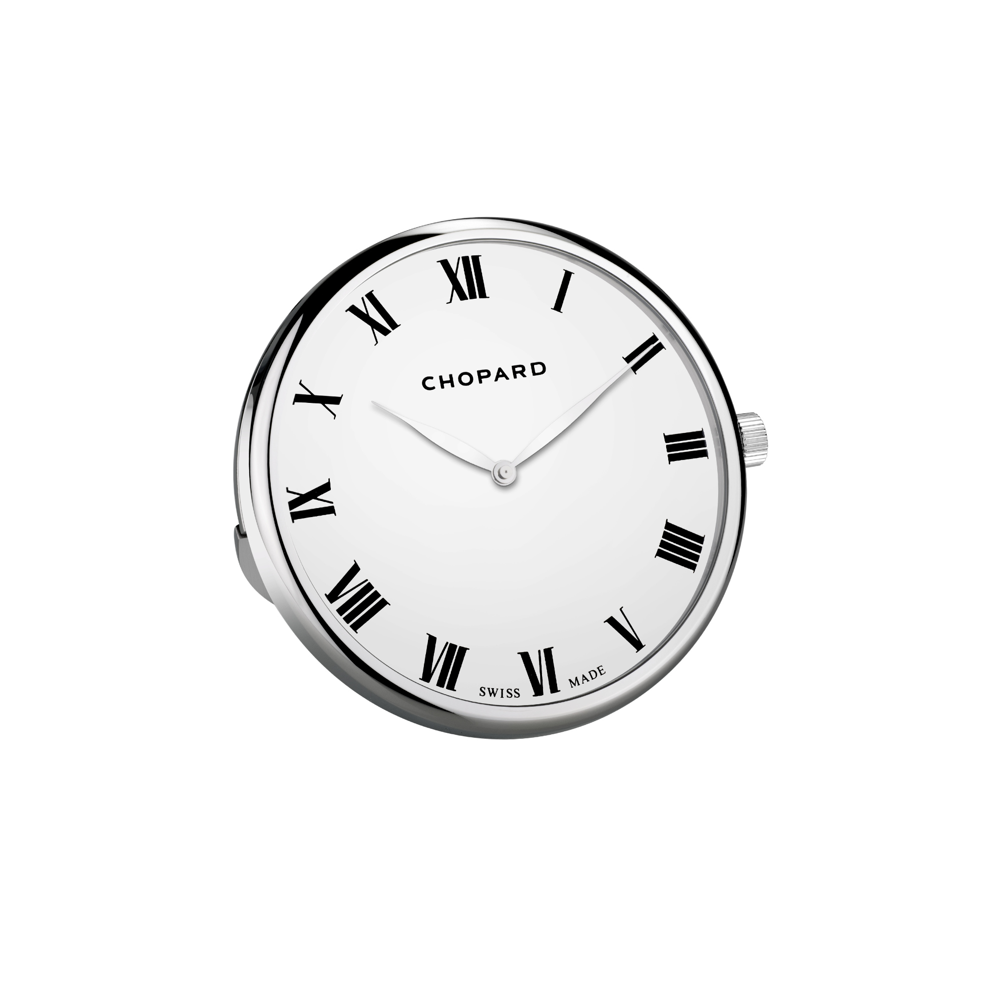 Ref. 95020-0091 - Raffinierte, übersichtliche Linien zeichnen diese klassische Tischuhr von Chopard aus. Elegante römische Ziffern stehen im Mittelpunkt eines strahlend weißen Zifferblatts, das in glänzendem Edelstahl untergebracht ist. Die Zeit sah noch nie so gut aus.