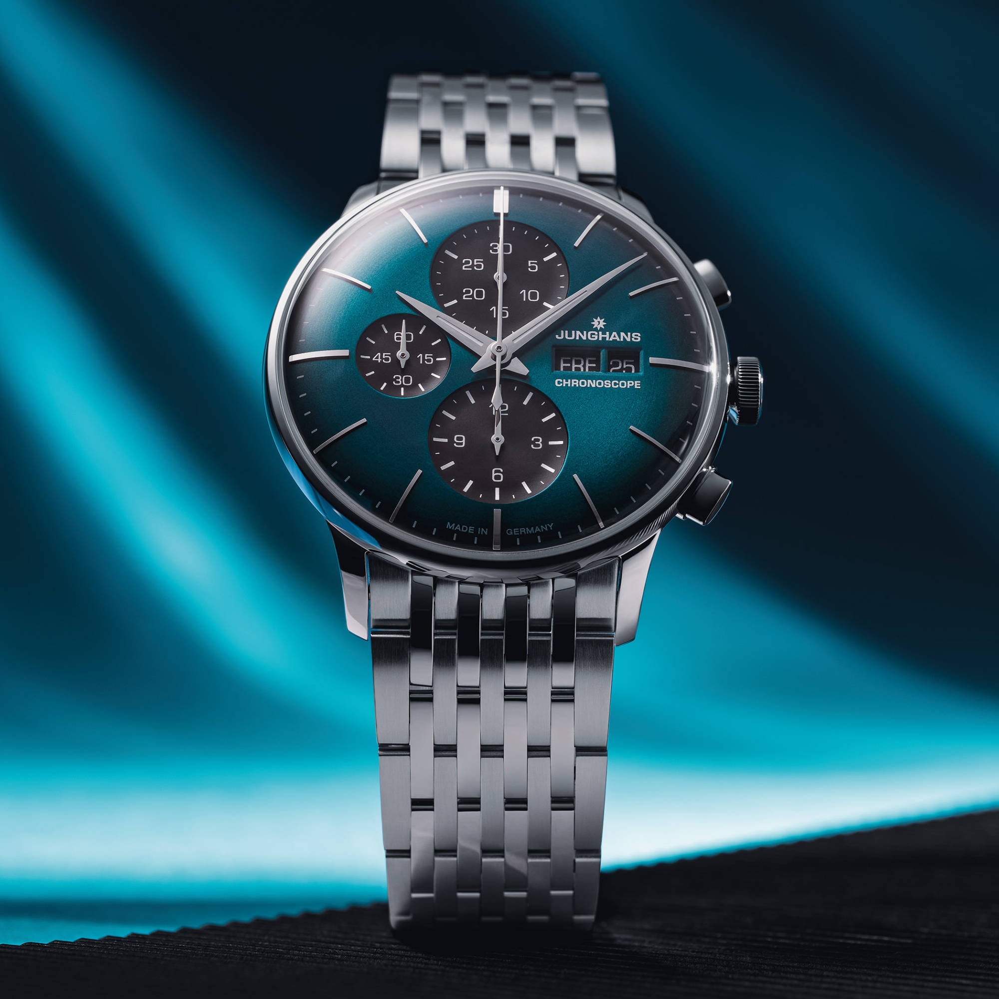 Ref. 27/4622.46 - Junghans Meister Uhren sind seit fast einem Jahrhundert verlässliche Zeitgeber.Basierend auf historischen Vorbildern, die ab den 1930er Jahren entstanden sind, sind sie heute zeitgemäß interpretiert. Auf 150 Uhren limitiert ist die sportlich-moderne Edition 2026 mit Metallband und petrolfarbenem Zifferblatt. Die für die Meister Uhren typischen, schalenförmig eingelassenen Hilfszifferblätter sind matt schwarz.