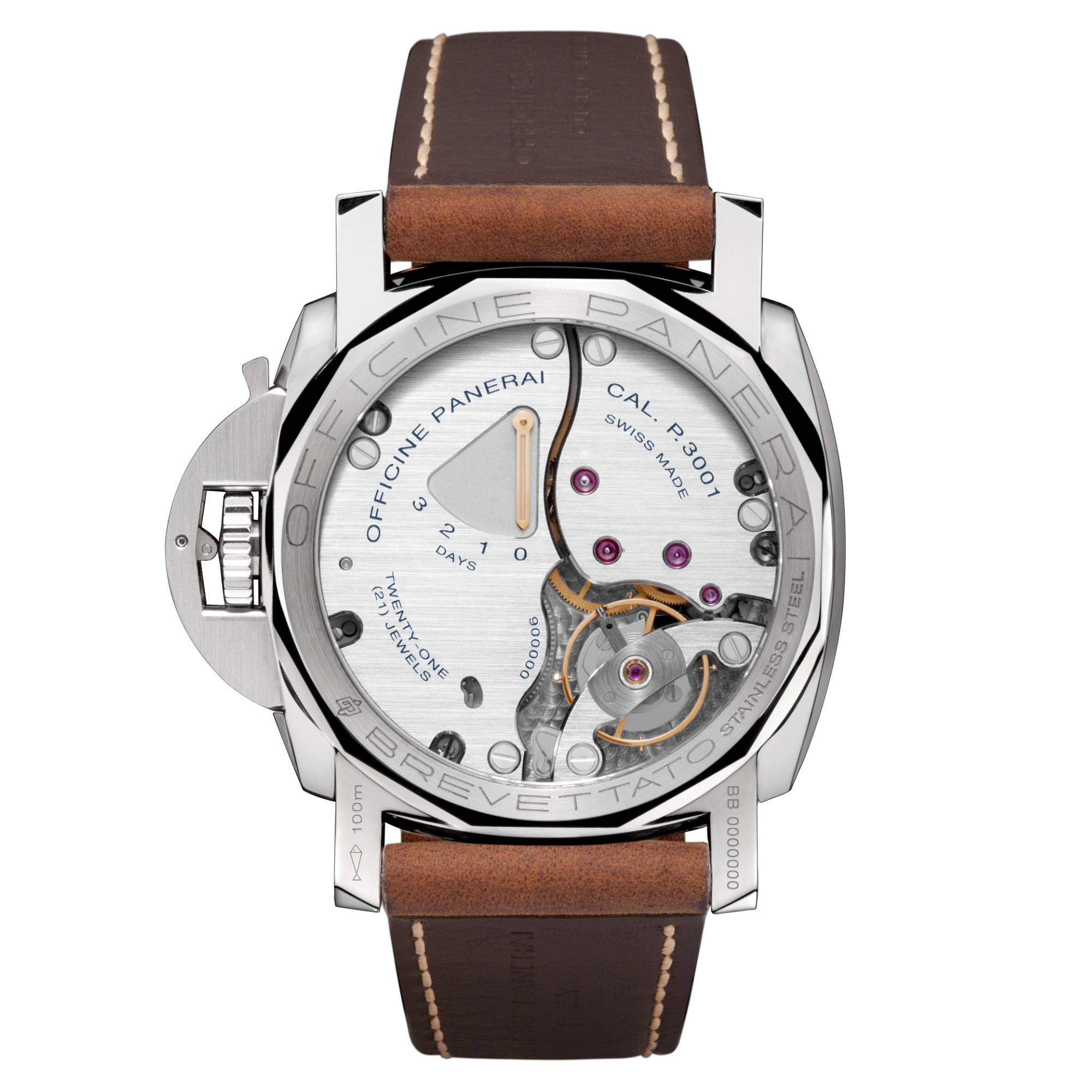Stunde, Minute, kleine Sekundenanzeige, Gangreserveanzeige auf der Gehäuserückseite, Sekundenrückstellung