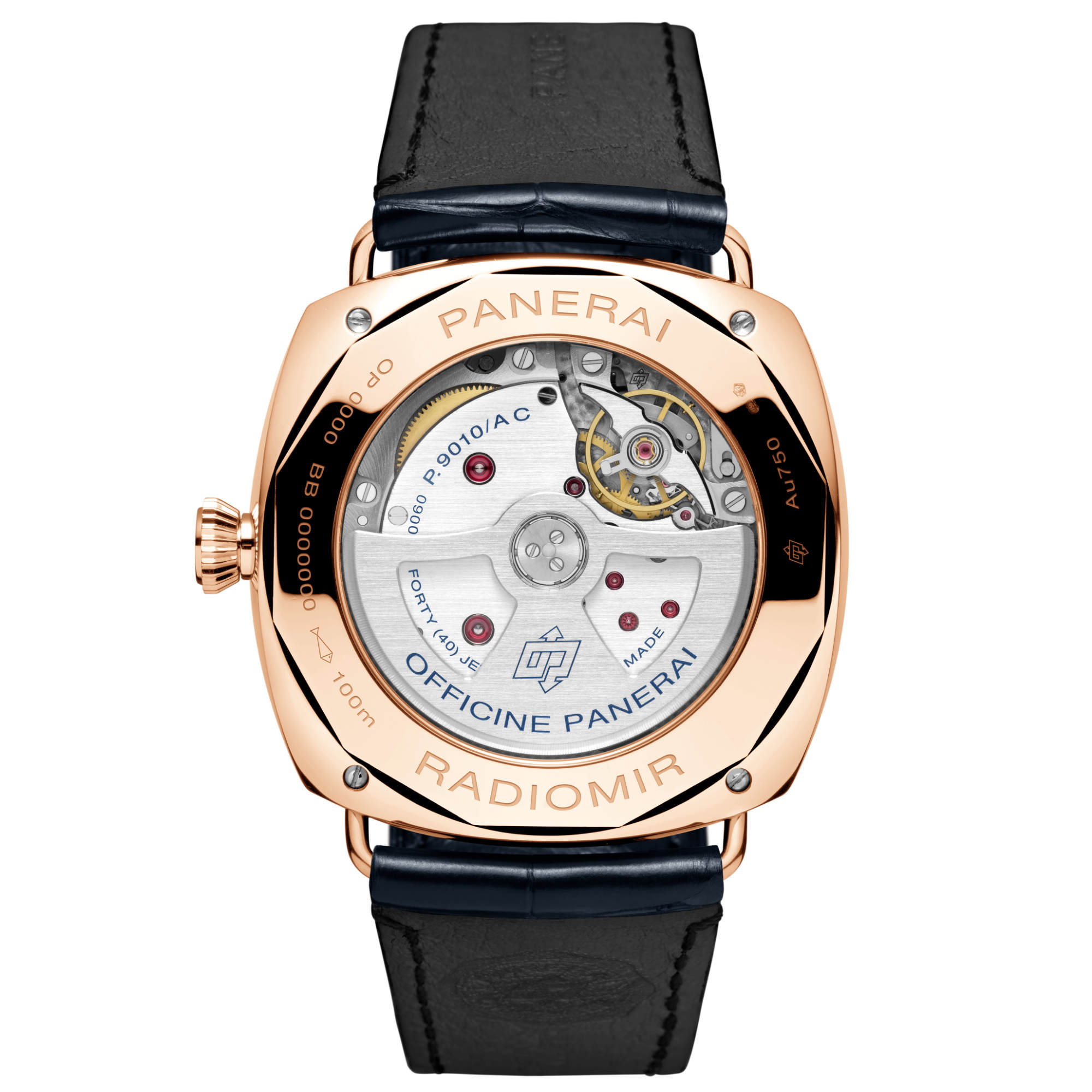 Ref. PAM01363 - Die PAM01363 mit einem blau schattierten Zifferblatt mit Sonnenschliff, das in der Mitte hell ist und an den Rändern dunkler wird, besitzt ein mattblaues, handgefärbtes Alligatorlederarmband und ein 45-mm-Gehäuse aus Goldtech™.