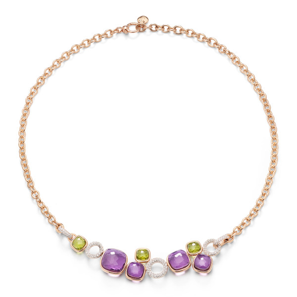 Ref. PCC6021O6WHRBPEIY - Wenn ein einziger Stein ein ganzes Spektrum an Gefühlen in sich tragen kann, versteht man die Magie von Nudo. In diesem Jubiläumsmoment feiert Pomellatos ikonischste Kreation Farbe in perfekter Harmonie – Edelsteine, die im idealen Gleichgewicht miteinander schwingen. Diese Nudo Halskette vereint violette Amethyste und klargrüne Peridots in einer sanft asymmetrischen Anordnung – jeder Stein geformt mit Nudos charakteristischen 57 unregelmäßigen Facetten. Pavé-Ringe aus weißen Diamanten setzen einen leuchtenden Kontrapunkt, während das Zusammenspiel der Größen Maxi, Classic, Petit und Mini einen natürlichen Rhythmus entlang des Dekolletés entstehen lässt. Der Clessidra-Schliff verleiht zusätzliche Dimension und lässt die Steine besonders nah auf der Haut liegen – für eine noch intensivere Verbindung zwischen Schmuck und Trägerin.