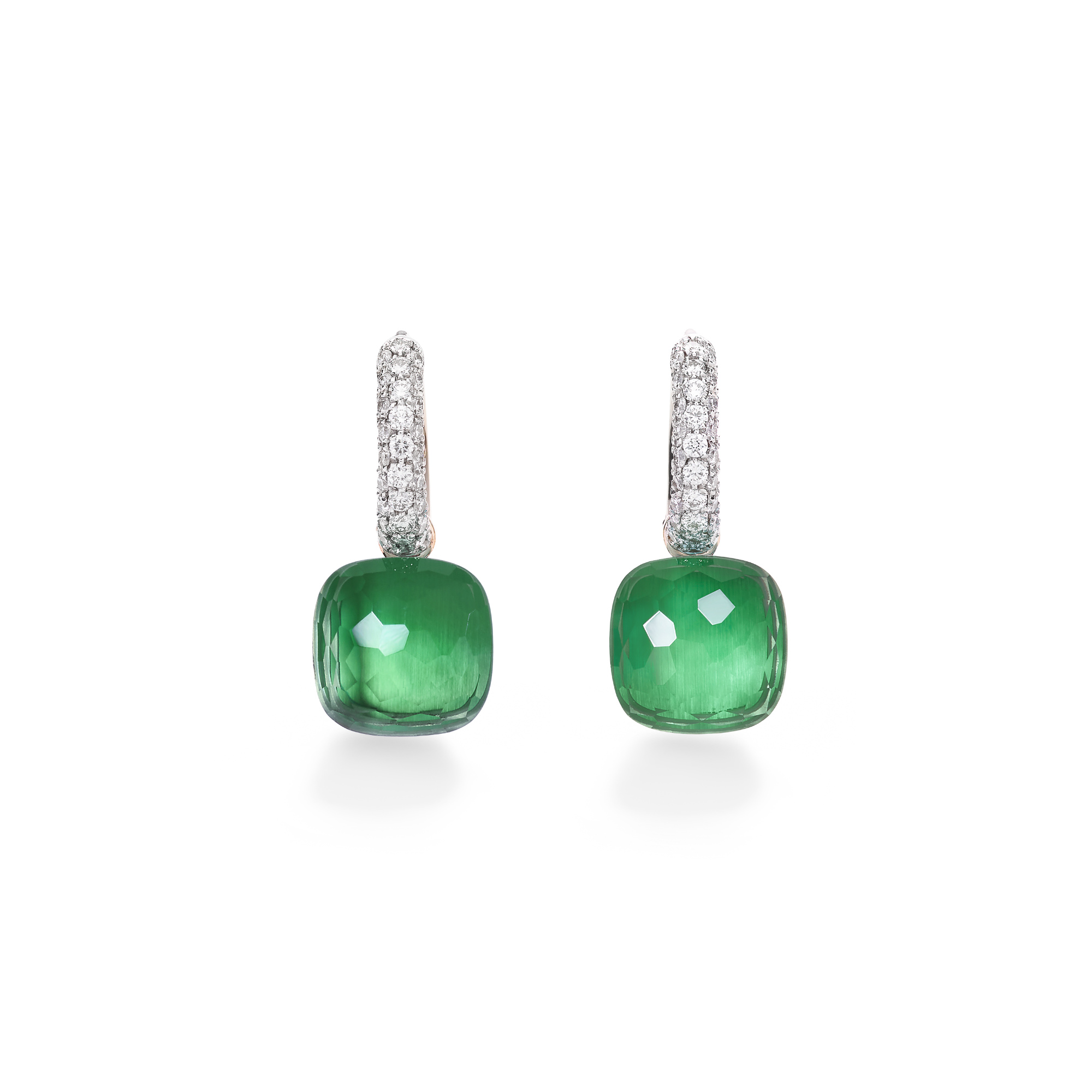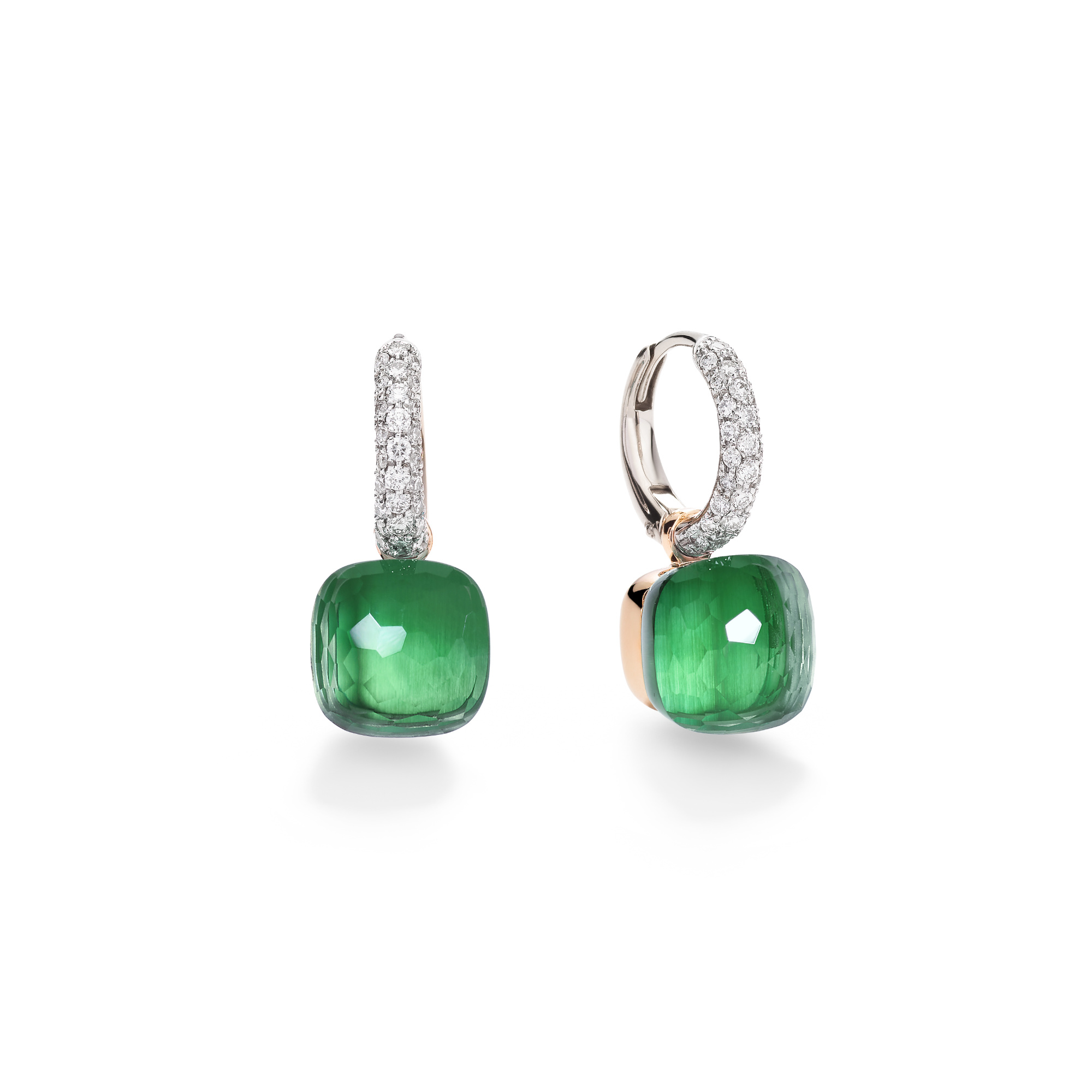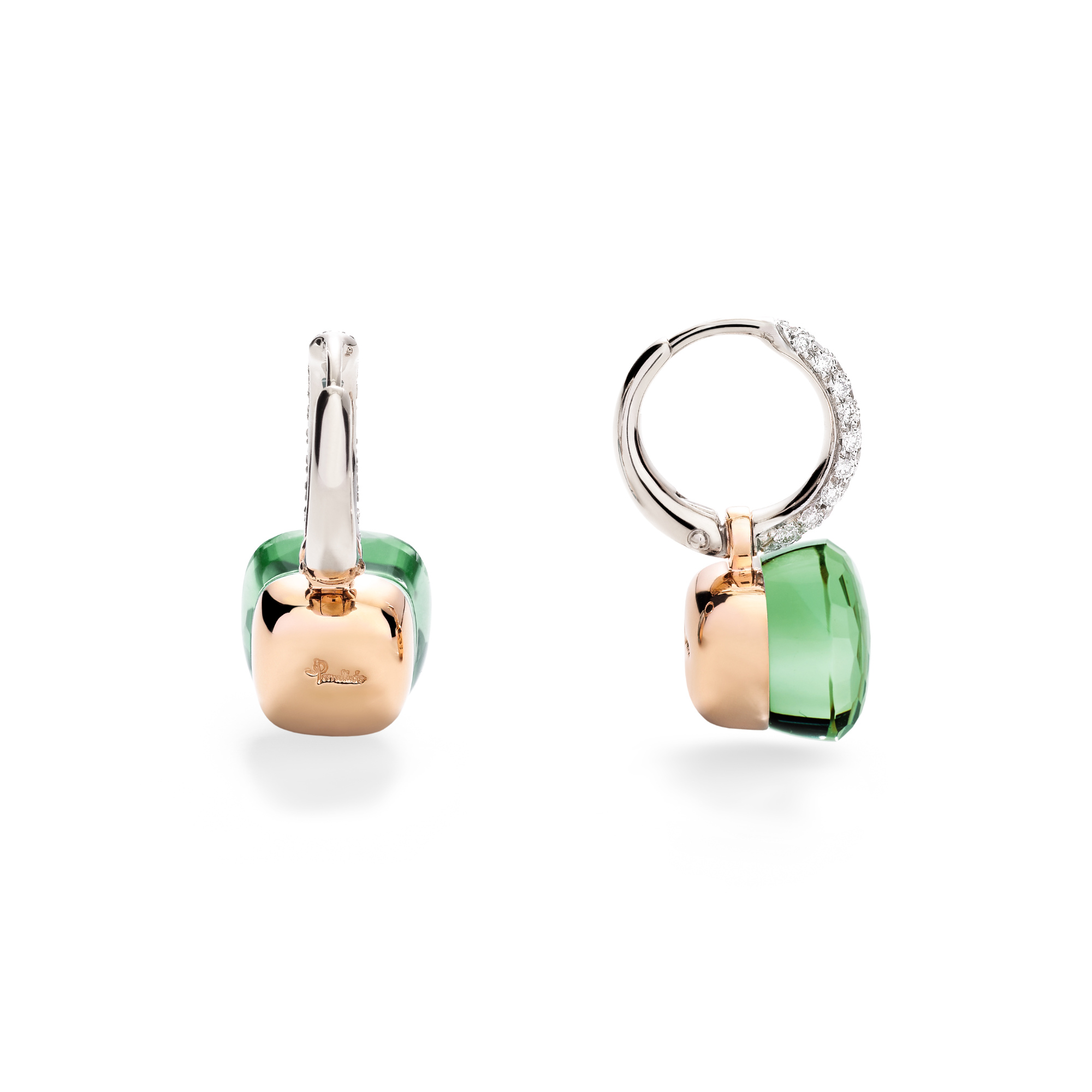 Ref. POB4010O6WHRBPAAV - Wenn ein einziger Stein ein ganzes Spektrum an Gefühlen in sich tragen kann, versteht man die Magie von Nudo. In diesem Jubiläumsmoment feiert Pomellatos ikonischste Kreation Farbe in perfekter Harmonie – Edelsteine, die im idealen Gleichgewicht miteinander schwingen. Die Nudo Ohrringe aus 18-karätigem Rosé- und Weißgold setzen das Doublet aus Prasiolith und grünem Achat in Szene – mit einer leuchtenden, changierenden Palette aus übereinander gelagerten Grüntönen. An pavébesetzten Creolen aus rhodiniertem Weißgold schwebend, entfalten die Steine eine farbliche Tiefe, die aus dem Zusammenspiel von transparentem Prasiolith und tiefgrünem Achat entsteht. Ihre fließende Bewegung und skulpturale Klarheit verleihen der Kollektion moderne Raffinesse – ein eleganter, zeitgemäßer Ausdruck von Nudos charakteristischer Farbalchemie.